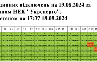 Завтра, 19 серпня, з 17:00 до 21:00 буде застосовуватись одна черга вимкнень, повідомила НЕК "Укренерго". В інші години – без обмежень. Причина застосування заходів обмеження – зростання споживання через спеку.