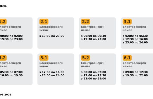 Група 1.1. Електроенергії немає з 05:30 до 09:00, з 16:00 до 19:30.