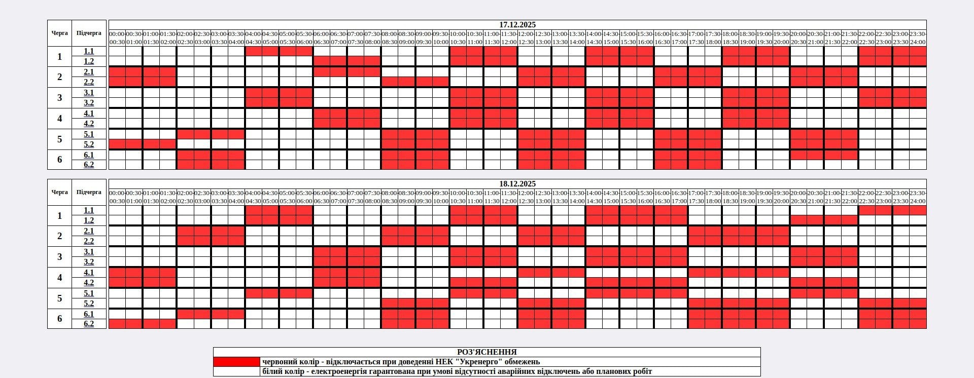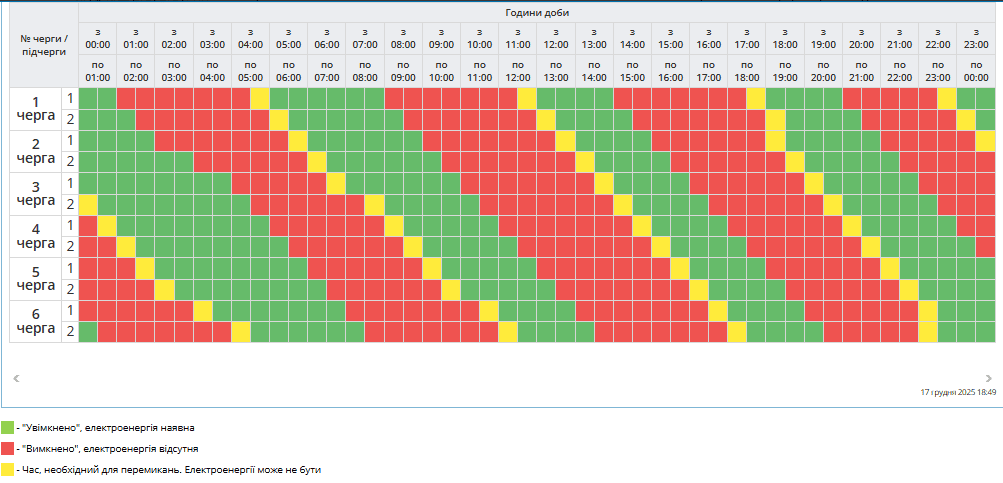 АТ «Сумиобленерго» оприлюднило графіки погодинних відключень на завтра, 18 грудня, за вказівкою НЕК «Укренерго».