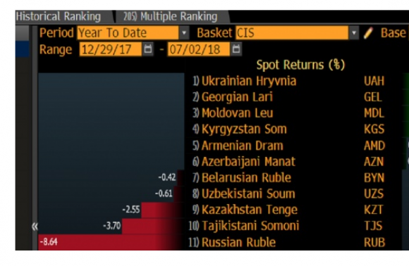 Без санкцій США, введених в квітні, він міг би бути на чотири відсотки міцнішим, кажуть в Банку Росії. При цьому лідерами рейтингу стали національні валюти України (плюс 7,14%), Грузії (плюс 6,1%) та Молдови (плюс 1,69%). Росія все частіше приймає на себе весь тягар зміни настроїв інвесторів, в той час як чотири пострадянські валюти показали зростання, потрапивши в топ-10 по динаміці в світі в цьому році.