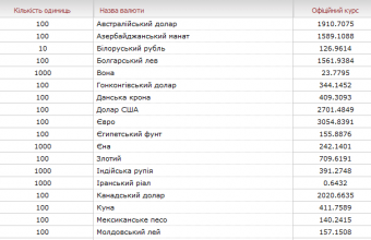 Національний банк України зафіксував офіційний курс гривні на рівні 2701,4849 гривні за долар (у п'ятницю – 26,7165) та 3054,8391 за євро (напередодні – 30,1763).