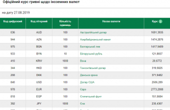 Національний банк України зафіксував офіційний курс гривні на рівні 25,0629 гривні за долар (у п’ятницю – 25,0427) та 27,7321 – за євро (23 серпня – 27,7548).