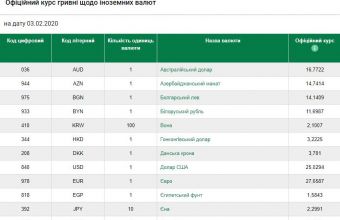 Національний банк України зафіксував офіційний курс гривні на рівні 25,0294 гривні за долар (у п'ятницю – 24,9196) та 27,6587 – за євро (31 січня – 27,4751).
