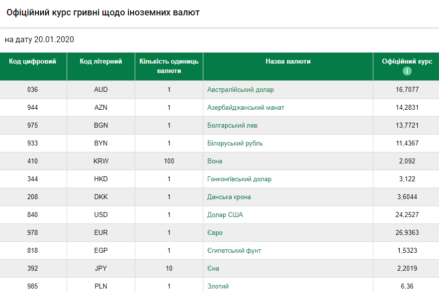 Національний банк України зафіксував офіційний курс гривні на рівні 24,2527 гривні за долар (у п'ятницю – 24,0923) та 26,936 – за євро (напередодні – 26,9003).