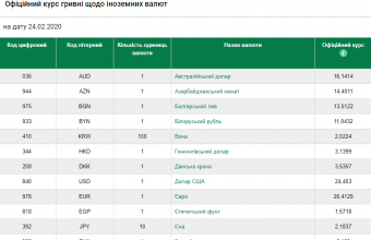 Національний банк України встановив офіційний курс гривні на рівні 24,453 гривні за долар проти 24,4777 гривні за долар у п'ятницю. Офіційний курс гривні до євро встановлено на рівні 26,4129 гривні проти 26,4129 гривні 21 лютого.