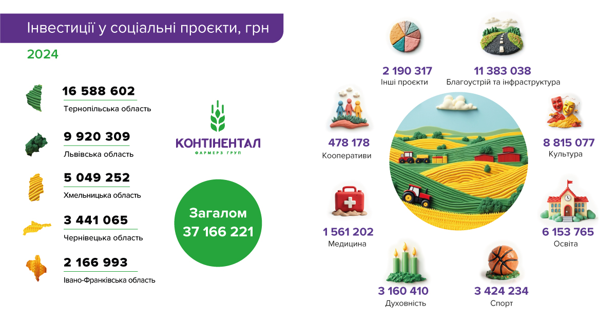 У 2024 році «Контінентал Фармерз Груп» сплатила рекордну для себе суму податків. Розмір податкових відрахувань до бюджетів усіх рівнів сягнув 1 млрд 624 млн грн, що на 210 млн грн більше, ніж у попередньому році. Також Компанія продовжила активно підтримувати громади, на території яких веде свою діяльність: на втілення соціальних проєктів у п’яти західних областях України спрямувала понад 37,1 млн грн.