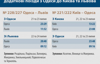 У прес-центрі «Укрзалізниці» уточнили, що поїзд №228/227 Одеса – Львів здійснить рейси з Одеси 21 та 23 липня. Відправлення – о 23:29, а прибуття до Львова – об 11:52.