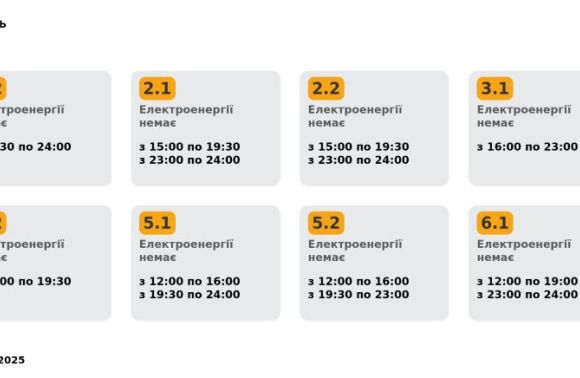 А групам 2.1, 2.2 двічі вимикатимуть до кінця дня електроенергію - 15:00 до 19:30 та 23:00 до 24:00, групи 6.1, 6.2 не матимуть світла з 12:00 до 19:00 та 23:00 до 24:00.