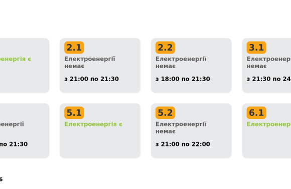 Група 6.2. Електроенергії немає з 21:30 до 24:00.