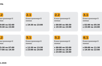 Група 1.1. Електроенергії немає з 05:30 до 09:00, з 17:00 до 19:30.