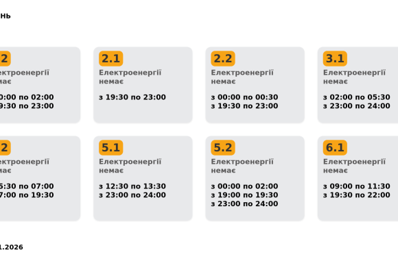 Група 5.2. Електроенергії немає з 00:00 до 02:00, з 19:00 до 19:30, з 23:00 до 24:00.