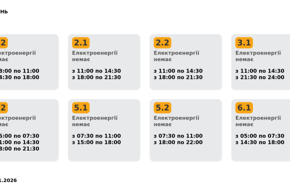Група 3.1. Електроенергії немає з 11:00 до 14:30, з 21:30 до 24:00.