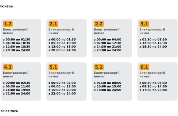Група 5.1. Електроенергії немає з 00:00 до 02:30, з 06:00 до 12:00, з 15:00 до 20:00, з 22:00 до 24:00.