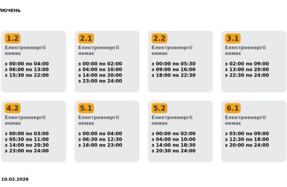 Група 6.2. Електроенергії немає з 00:00 до 02:00, з 05:30 до 12:00, з 16:00 до 23:00.