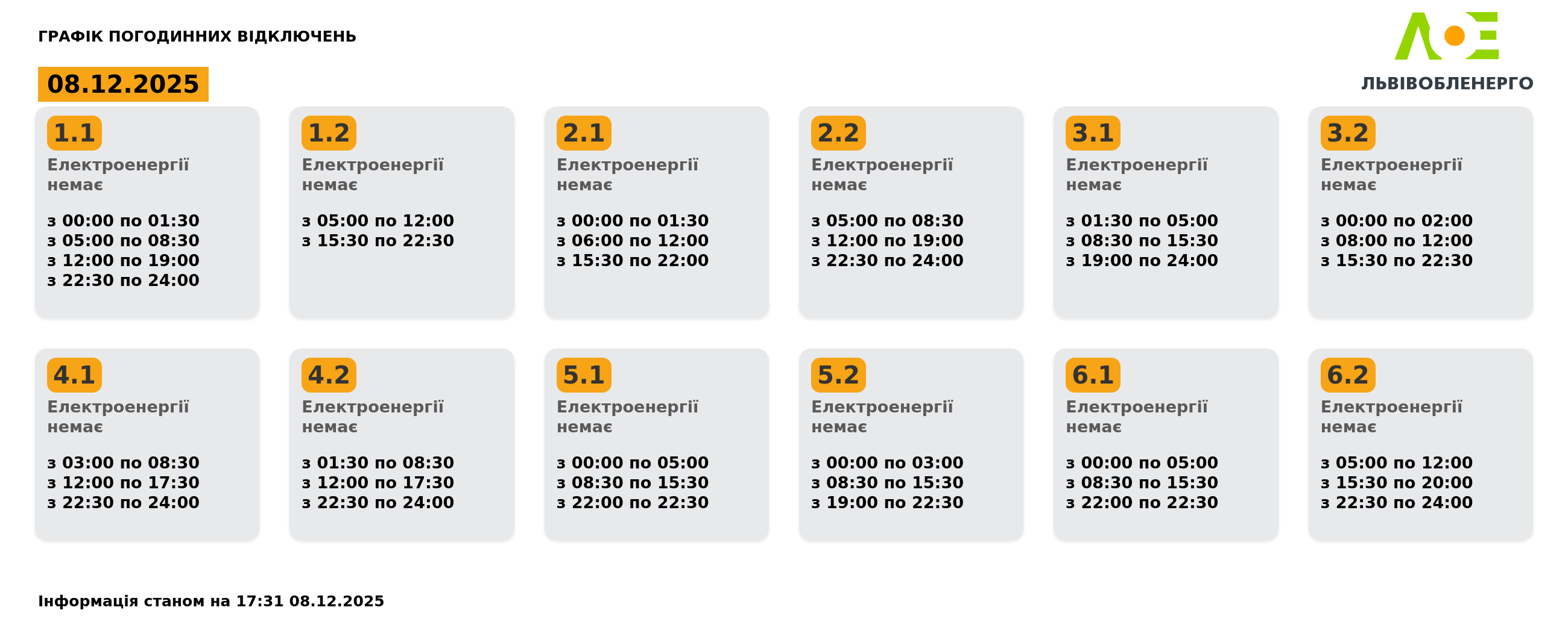 Група 3.1. Електроенергії немає з 01:30 до 05:00, з 08:30 до 15:30, з 19:00 до 24:00.