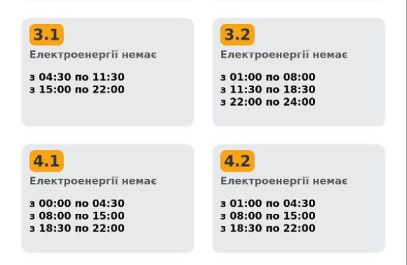 Група 3.1. Електроенергії немає з 04:30 до 11:30, з 15:00 до 22:00.