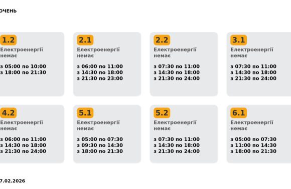 Група 6.1. Електроенергії немає з 05:00 до 07:30, з 11:00 до 14:30, з 18:00 до 21:30.