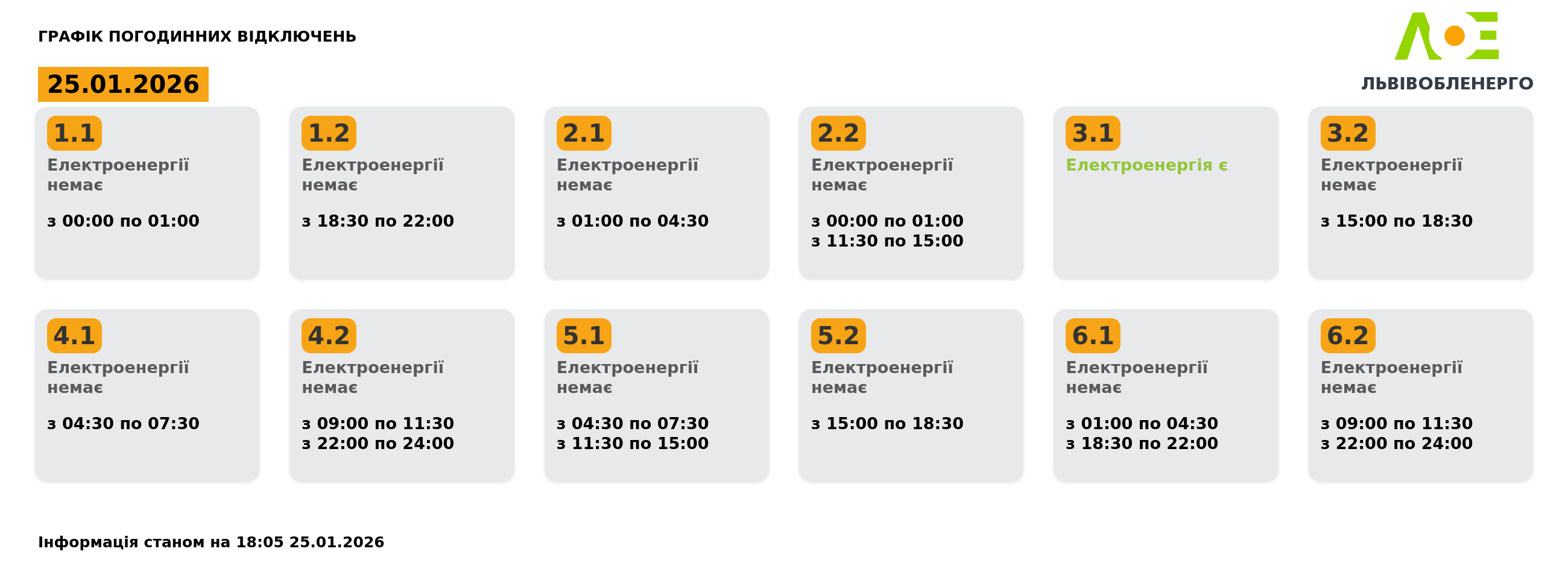 Група 6.1. Електроенергії немає з 01:00 до 04:30, з 18:30 до 22:00.