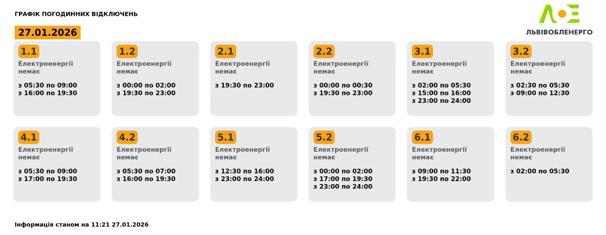 Порівняно з попередніми оновленнями (08:24 та 10:47), останній графік станом на 11:21 демонструє подальше скорочення періодів без електроенергії: