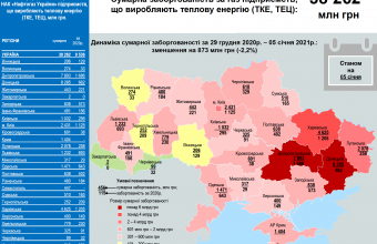 Сумарна прострочена заборгованість перед НАК «Нафтогаз України» підприємств теплокомунальної енергетики і теплоелектроцентралей за природний газ, використаний для виробництва теплової енергії, складає близько 38,3 млрд грн, з них за 2020 р. — 9,5 млрд грн. За перший тиждень 2021 року ця заборгованість зменшилась на 873 млн грн (2,2%).