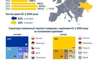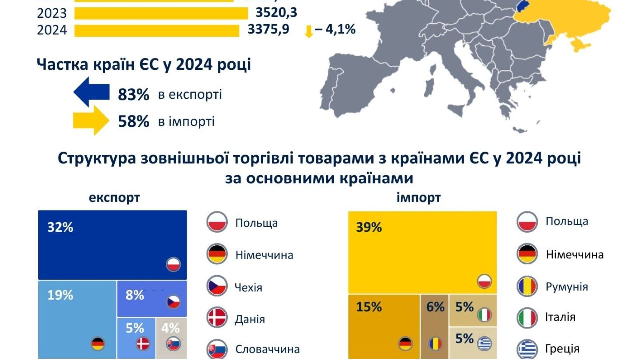 Порівняно з 2023 роком експорт до країн ЄС збільшився на 4,7% імпорт – зменшився на 4,1%. Порівняно з довоєнним 2021 роком експорт до країн ЄС збільшився на 0,7%, імпорт – на 37,2%.