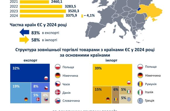 Порівняно з 2023 роком експорт до країн ЄС збільшився на 4,7% імпорт – зменшився на 4,1%. Порівняно з довоєнним 2021 роком експорт до країн ЄС збільшився на 0,7%, імпорт – на 37,2%.