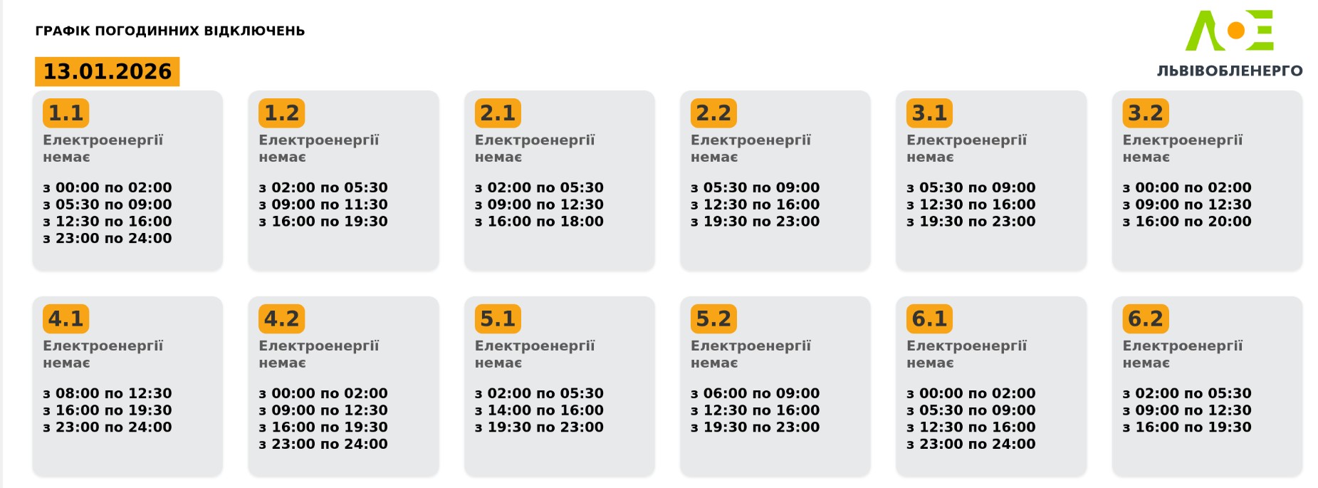 Львівобленерго скоригувало графік погодинних відключень на 13.01.2026, пише DailyLviv.com.