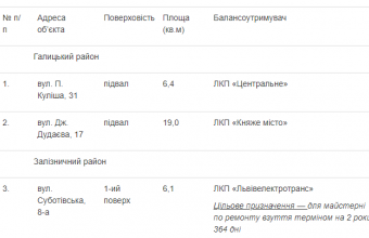 У прес-службі Львівської міськради також опублікували перелік об’єктів нерухомості, які вона пропонує орендувати.