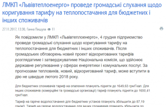 У «Львівтеплоенерго» повідомили сьогодні, 27 листопада, що 4 грудня це підприємство проведе громадські слухання щодо коригування тарифу на теплопостачання для бюджетних і інших споживачів, після яких новий проект відкоригованих тарифів розглядатиме і затверджуватиме Національна комісія, котра здійснює державне регулювання у сферах енергетики і комунальних послуг. За прогнозами тепловиків, новий, відкоригований тариф, може вступити в дію не швидше лютого 2018 року.