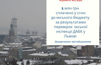 «За перший місяць цього року Міська інспекція архбудконтролю у Львові стягнула до міського бюджету понад 1 млн гривень штрафів. Якщо бути точними – 1 048 493 гривень. Попри усі зміни, які пережила і переживає зараз містобудівна галузь, міська інспекція ДАБК у Львові працює і продовжує контролювати забудови. Від початку року інспектори провели 68 перевірок і винесли 16 постанов про притягнення до адміністративної відповідальності.