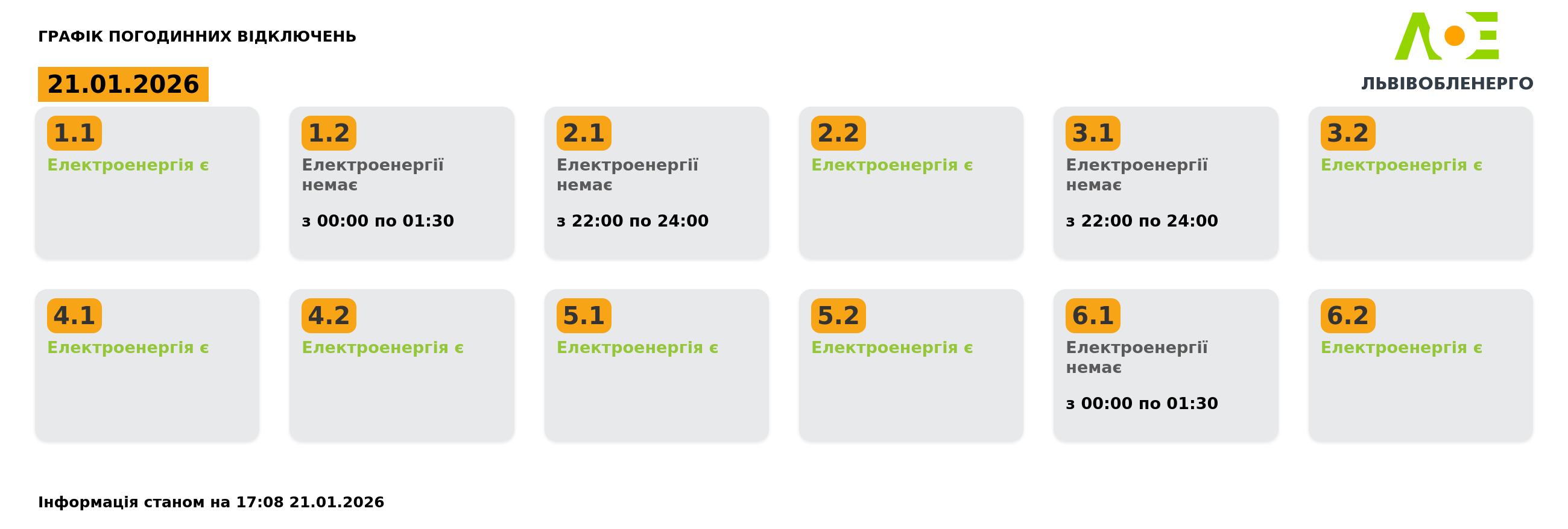 Графік погодинних відключень на 21.01.2026 станом на 17:08: