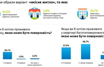 · 42% опитаних зазначають, що для повноцінного життя їм було б достатньо двох кімнат (кореляція відповідей між кількістю членів сім’ї до кількості кімнат – що більша кількість членів сім’ї, то більше потрібно кімнат). Спальня, кухня, вітальня і санвузол – найнеобхідніші частини житла для 80% опитаних.