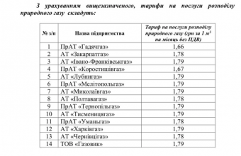 "НКРЕКП провела ряд переговорів з облгазами. 14 з них на даний момент погодилися обмежити тариф на передачу 1,79 грн. Таким чином, рішення Кабміну встановити верхню межу роздрібної ціни на газ на рівні 6,99 грн за м3, приводять споживачів до кінцевої ціни від 8,65-8,78 грн.