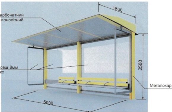 Комунальне підприємство замовило 21 склопластико-металеву споруду по 370 тис грн. Їхній виробник невідомий. Вони мають довжину 5 м, ширину 1,80 м і висоту 2,50 м, металевий каркас, дах із полікарбонатного монолітного листа та стінки зі скла триплекс товщиною 8 мм.