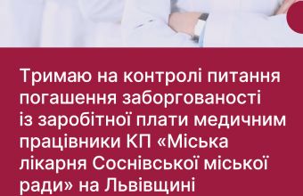 18 медиків Комунального підприємства «Міська лікарня Соснівської міської ради» на Львівщині оголосили голодування, у зв’язку з невиплатою всьому трудовому колективу заробітної плати, починаючи з квітня 2021 року.