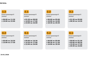 Група 1.1. Електроенергії немає з 00:00 до 01:30, з 05:00 до 08:30, з 12:00 до 15:30.