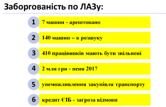 Андрій Садовий також зазначив: «Арешт вже накладений на всі автобуси АТП-1, їх забирають на штрафмайданчик. Завтра усі заберуть, що тоді? По закону є два варіанти вирішити питання. Перше: перерахувати кошти на рахунки АТП-1, але це виконавча служба забирає одразу. А в ЛАЗу є борг за тепло 2,3 млн. гривень перед «Львівтеплоенерго». Борг по зарплаті працівників ЛАЗу – 2,5 млн. гривень».