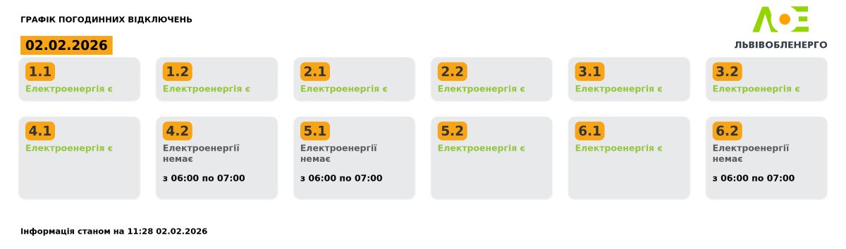 Група 4.2. Електроенергії немає з 06:00 до 07:00.
