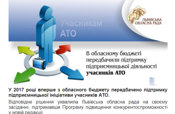 У прес-службі Львівської ОДА повідомили в четвер: «Департамент економічної політики Львівської облдержадміністрації інформує про оголошення з 1 лютого 2018 року в межах реалізації «Програми підвищення конкурентоспроможності Львівської області задля підтримки підприємницької ініціативи учасників АТО» конкурсу інвестиційних проектів. Підприємці-учасники АТО зможуть отримати з обласного бюджету відшкодовування частини відсоткової ставки за кредитами, отриманими у банках та кредитних спілках, які уклали генеральні угоди про співробітництво з департаментом економічної політики ЛОДА».