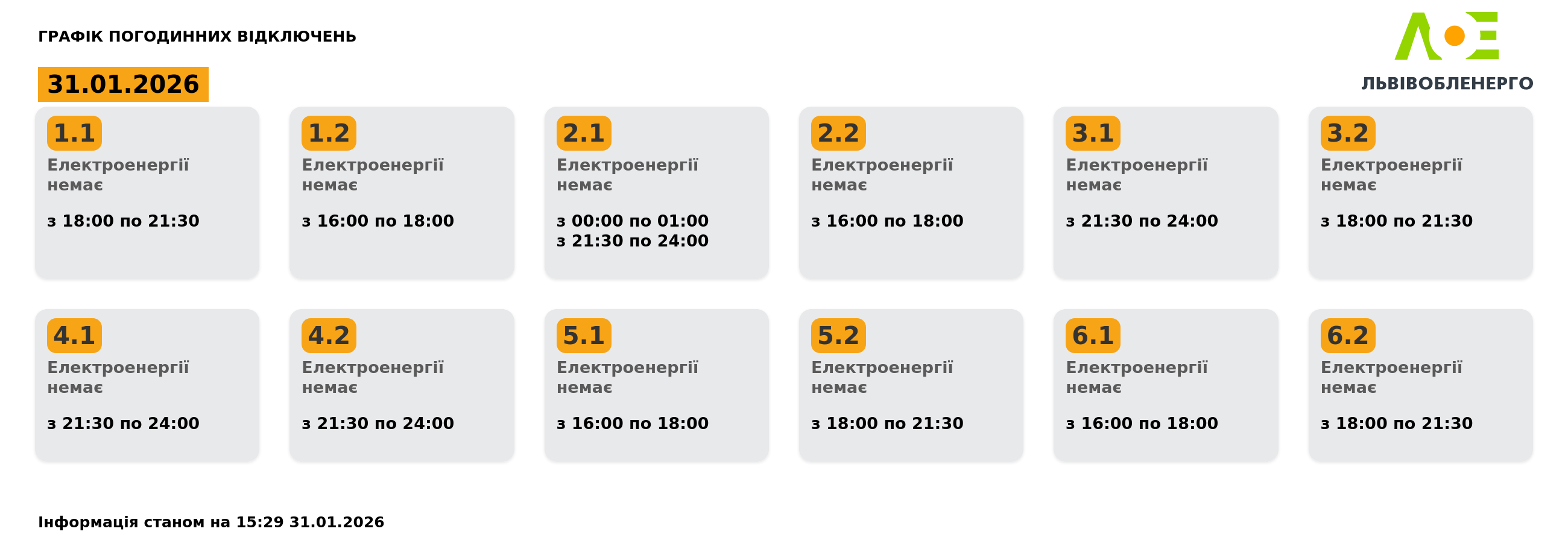 Графік погодинних вимкнень електроенергії на Львівщині 31 січня станом на 15.29: