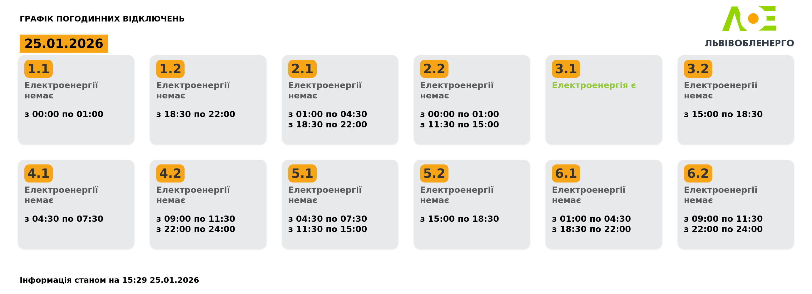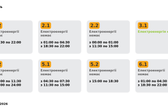 Група 6.2. Електроенергії немає з 09:00 до 11:30, з 22:00 до 24:00.