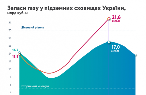 Про це повідомили в п’ятницю, 25 жовтня, в «Нафтогаз», де також розповіли: «Україна збільшила обсяги газу в підземних сховищах (ПСГ) до 21,6 млрд. кубометрів – на 4,5 млрд. кубометрів перевищує минулорічний показник на цю ж дату (25 жовтня)».