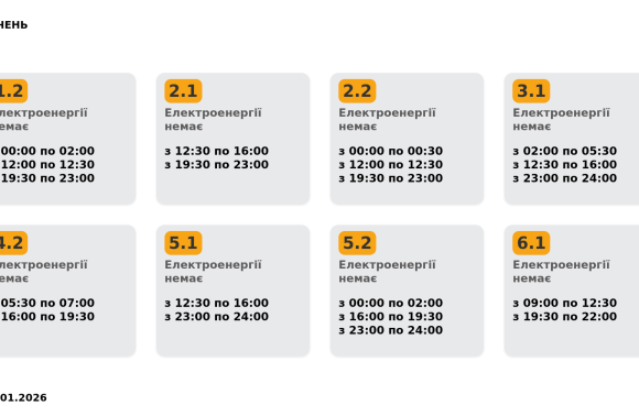 Група 1.2. Електроенергії немає з 00:00 до 02:00, з 12:00 до 12:30, з 19:30 до 23:00.