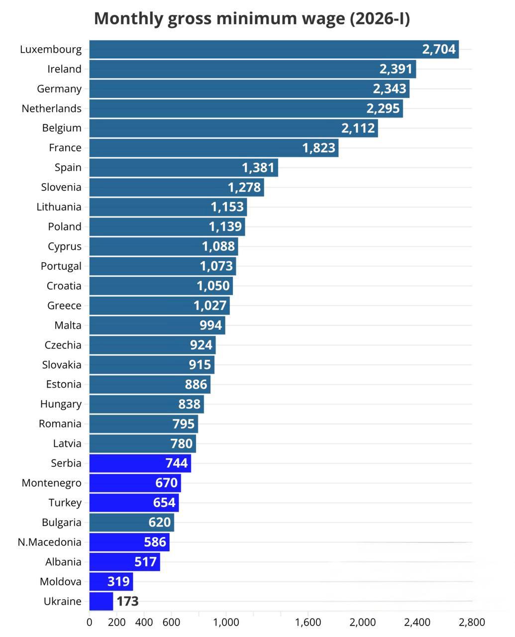 Найнижчі рівні мінімальної зарплати зафіксовані в країнах, що не є членами ЄС або перебувають у процесі інтеграції.