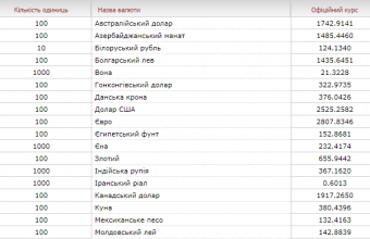 Національний банк України зафіксував офіційний курс гривні на рівні 25,2526 гривні за долар (у понеділок – 25,4397) та 28,0783 – за євро (напередодні – 28,3347).