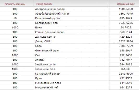 Національний банк України зафіксував офіційний курс гривні на рівні 28,26598 за долар (у п'ятницю – 28,3356) та 32,0678 – за євро (у п'ятницю – 32,3479).