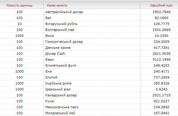 Національний банк зафіксував офіційний курс гривні на рівні 26,219 за долар (у вівторок – 26,2902) та 31,1219 – за євро (у вівторок – 31,2906).