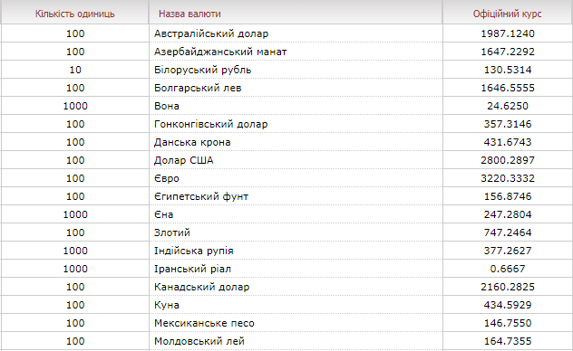 Національний банк України зафіксував офіційний курс гривні на рівні 28,0029 гривні за долар (у середу – 28,0814) та 32,2033 – за євро (в середу – 32,1111).