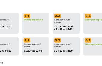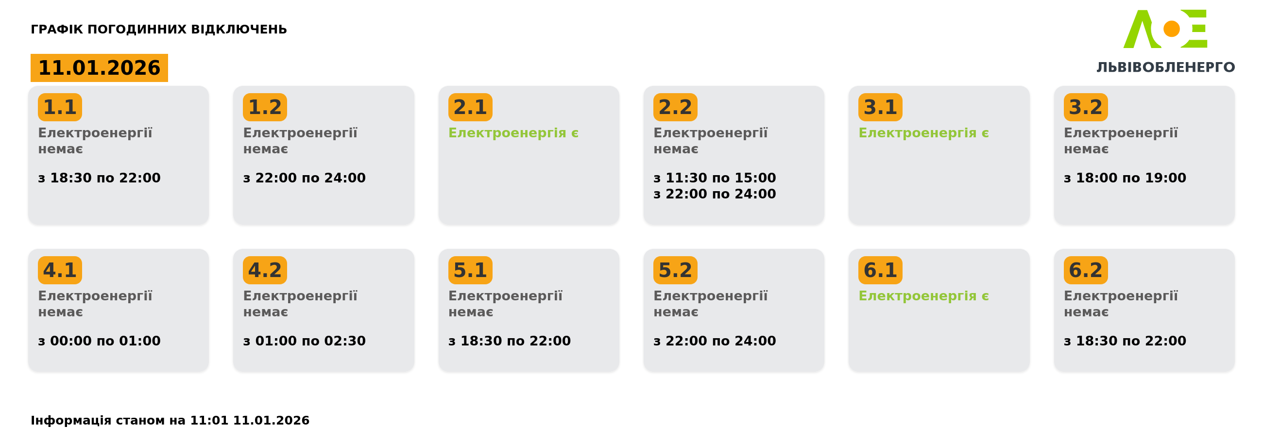 Група 1.1. Електроенергії немає з 18:30 до 22:00.