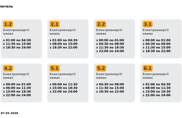 Група 4.2. Електроенергії немає з 00:00 до 01:00, з 06:00 до 11:30, з 15:00 до 18:30, з 22:00 до 24:00.